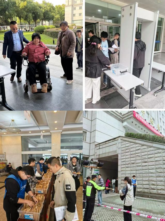 考试期间,我校考点组织严密,秩序井然。严格落实手机集中管理措施,启用无线电信号屏蔽设备,强化“人防”与“技防”协同联动,严把考生入场安检关,坚决防范和打击高科技手段作弊,确保考试公平公正。同时,我校考点通过张贴考场分布引导图、设置备用考场、联系社区警务室为考生开具临时身份证明、设立医疗保障点等举措,积极为考生提供暖心服务,营造了既严肃又温馨的应试环境。