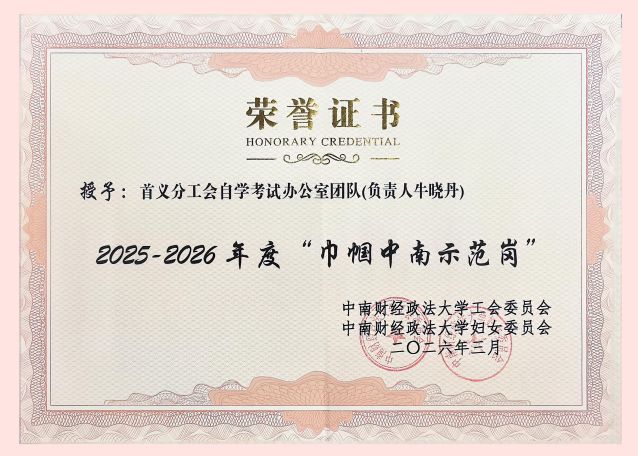 继教院网讯(通讯员 牛晓丹)近日,校工会、妇委会公布2025-2026年度“巾帼中南示范岗”评选结果,继续教育学院自学考试办公室(以下简称“自考办”)岗组以扎实的工作作风、突出的业绩和鲜明的巾帼风采,成功荣获该称号,彰显了我院女教职工的责任与担当。