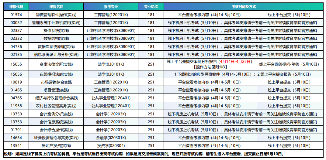 2026年上半年自学考试我校主考专业实践课程已进入考核阶段,现将考核内容及时间安排如下: