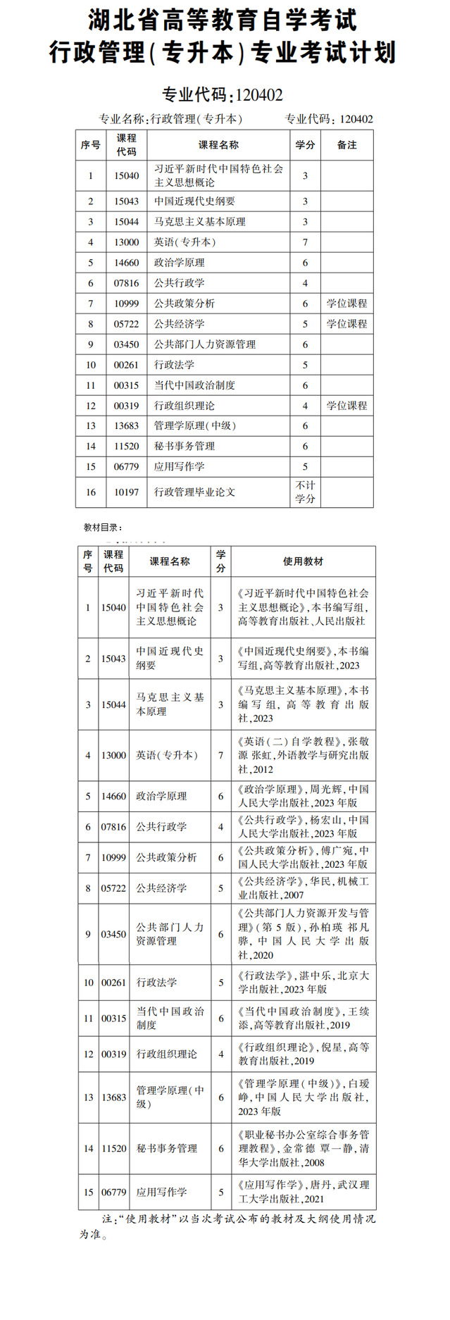 行政管理120402专业考试计划和教材目录(2025版更新)