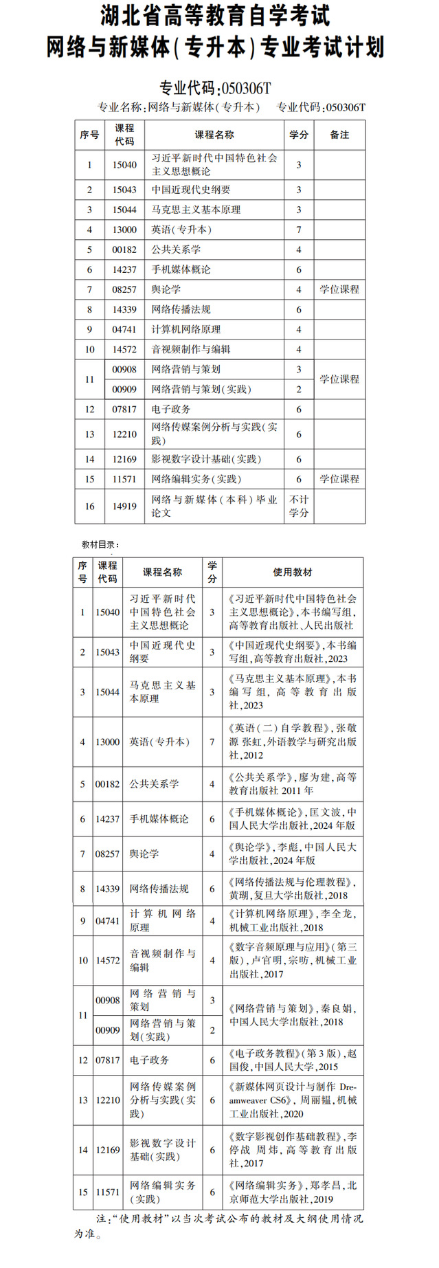 网络与新媒体050306T专业考试计划和教材目录(2025版更新)